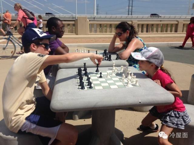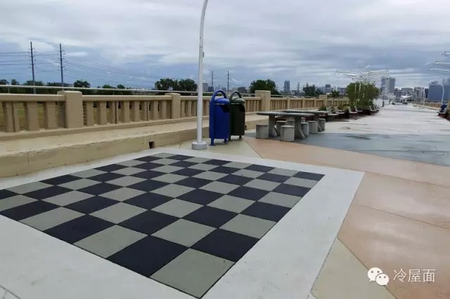 該橋距達拉斯市中區(qū)較近,憑欄遠眺,可以將當(dāng)?shù)赜忻娜缓印⑦_拉斯人工渠和瑪格麗特亨特山橋盡收眼底。該橋不僅成為一個供人游覽的名勝,而且還別出心裁地設(shè)計有休息區(qū),還有大小不一的國際象棋棋盤,游客不僅可以酣暢地捉對廝殺一盤,還可以親身在棋盤中穿越,樂趣無窮!